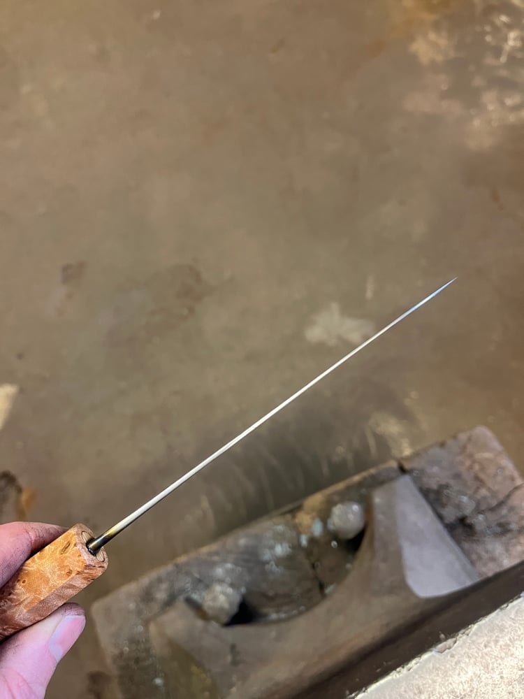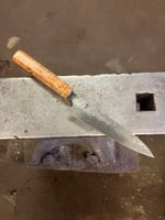 A very nimble petty made out of 80 layer Damascus combining 1.2419 and 15n20 for a high performance and beautiful blade.