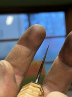 Forged Damasteel twist with a laser etched logo (not hot stamped), stabilized mango burl handle with brass bolster