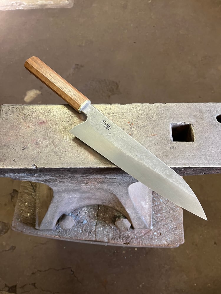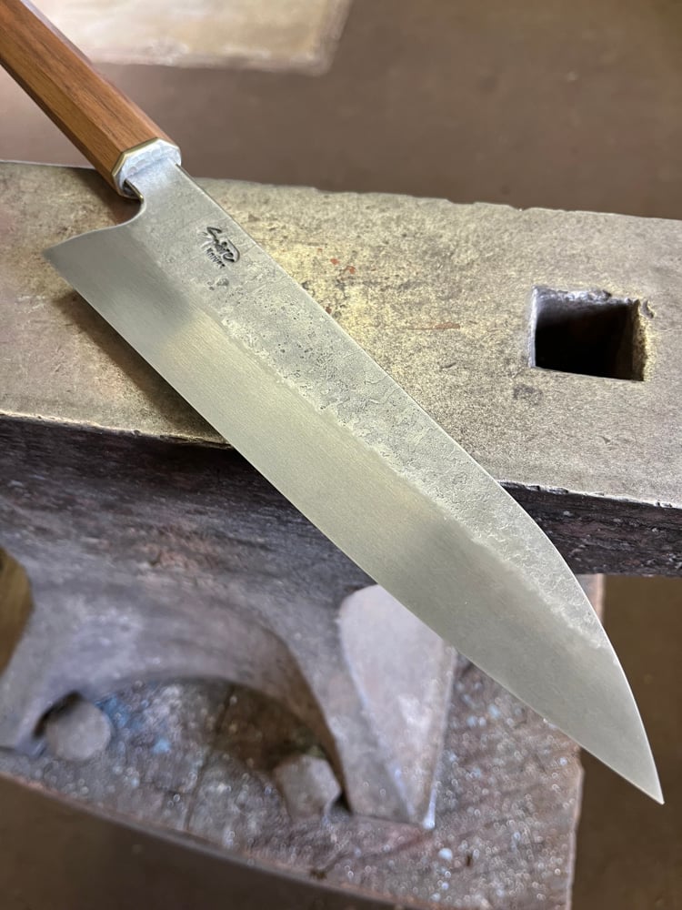 2092 (52100) carbon steel, walnut and sterling silver handle.