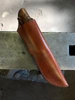 These are forged from damasteel dense twist and this one has a handle made out of walnut burl and brass bolster.